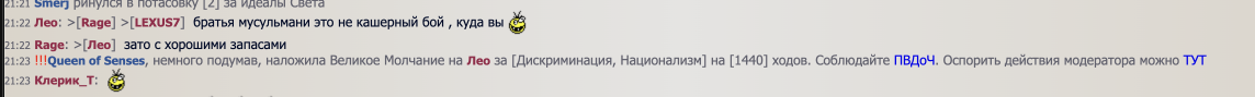 2. 21:23 !!!Queen of Senses, немного подумав, наложила Великое Молчание на Лео за [Дискриминация, Национализм] на [1440] ходов. Соблюдайте ПВДоЧ. Оспорить действия модератора можно ТУТЯ написал.